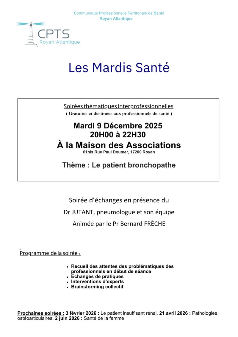 Après une première rencontre riche en échanges autour du patient en fin de vie, la CPTS Royan Atlantique vous donne rendez-vous pour le prochain Mardi Santé :